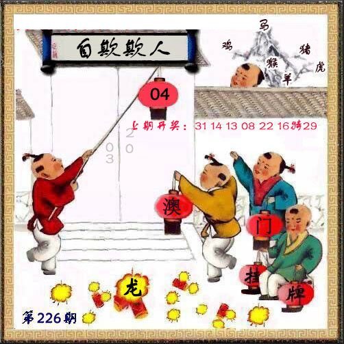 226期挂牌《自欺欺人》 解释:指既欺骗自己,也欺骗别人;常用以不肯面对事实。 解料:胆小肖鼠兔龙蛇羊鸡,挂:04鼠,鼠冲马,爆龙,龙冲狗。 七肖:鼠兔龙蛇鸡马狗 五肖:鼠兔龙蛇鸡 四肖:鼠兔龙蛇 三肖:鼠兔龙 二肖:鼠兔 一肖:鼠 |